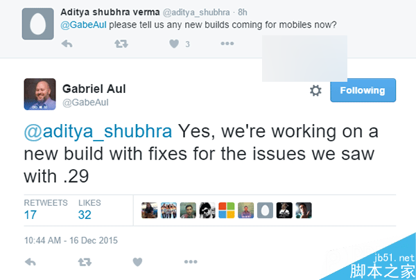 Windows Insier项目负责人Gabriel Aul在Twitter上表示,目前微软正在准备新的Windows 10 Mobile预览版,主要是来修复10586.29系统更新问题,但同时表示今天没有新版本推送,毕竟最新的Windows10 PC RedStone首个重大更新11082已经推送。