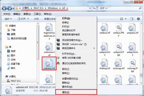 1、打开计算机并依次打开“windows——inf”文件夹,接着在inf文件夹下找到“usbstor.pnf”和“usbstor.inf”,这里我们以usbstor.inf文件举例:将鼠标移至usbstor.inf文件单击右键,在弹出的选项中点击“属性”项,如下图所示: