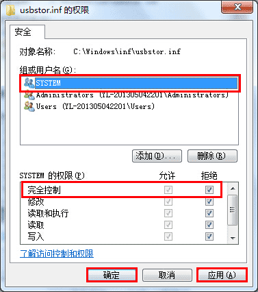 3、在弹出的usbstor.inf的权限窗口中单击组或用户名中的“SYSTEM”,接着再将完全控制后方的拒绝勾选上,点击“应用——确定”即可,如下图所示: