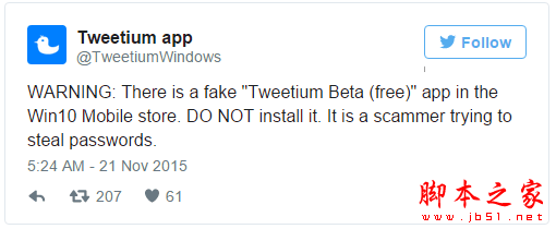 最早向用户发出警告的是Tweetium应用的官方Twitter,称不要下载安装该应用,以免被窃取密码。虚假应用编写者为了“广撒网”,还“山寨了”另外30款其他应用,例如“Madden NFL”,这些仿冒应用可能和Tweetium Beta作用相仿。根据外媒消息,目前微软已经着手清除这款虚假应用,不同地区市场的下架时间可能有所差异。已经安装的用户最好立即卸载。以上就是对Win10 Mobile虚假应用Tweetium Beta的介绍,为了您的安全,请及时处理该应用。