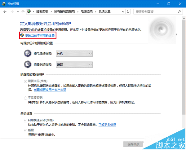 5、点击“保存修改”后生效遇到该问题的用户反映上述方法有效,不过缺点也显而易见:“快速启动”无法继续使用。因此在这种情况下,是否要解决该问题,还得取决于用户更重视哪项功能。等相应的驱动程序完善之后,二者“不共戴天”的问题才能完美解决。相关推荐: Win10休眠文件hiberfil.sys怎么彻底删除? win10黑屏就断网该怎么办?win10设置待机不断网的详细教程