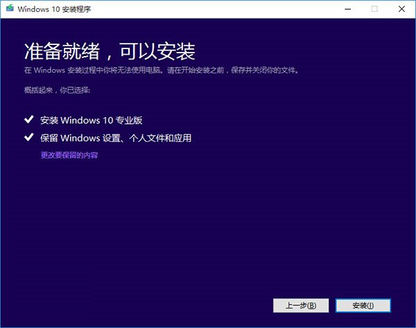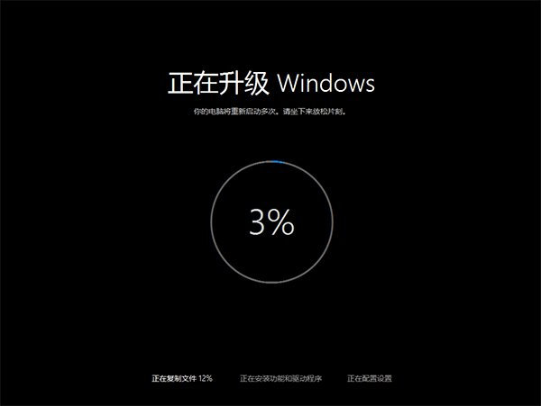 系统重新评估安装条件后,会再次打开“准备就绪”页面,此时点击“安装”即可出现上图的安装进行中界面。如果你选择保留所有内容升级,这将可能是一个比较耗时的过程,大约需要1小时以上,其间电脑会自动重启两次以上