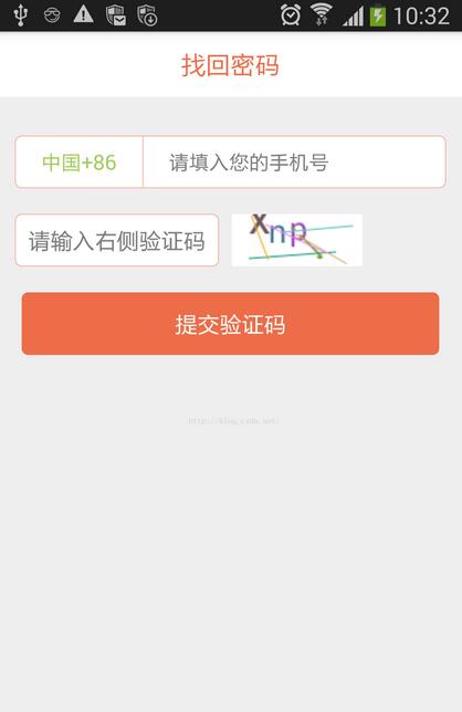public class Code { //随机数数组private static final char[] CHARS = {"2", "3", "4", "5", "6", "7", "8", "9","a", "b", "c", "d", "e", "f", "g", "h", "j", "k", "m","n", "p", "q", "r", "s", "t", "u", "v", "w", "x", "y", "z","A", "B", "C", "D", "E", "F", "G", "H", "I", "J", "K", "L", "M","N", "P", "Q", "R", "S", "T", "U", "V", "W", "X", "Y", "Z"}; private static Code bmpCode; public static Code getInstance() { if(bmpCode == null)bmpCode = new Code(); return bmpCode;} //default settings//验证码默认随机数的个数private static final int DEFAULT_CODE_LENGTH = 4;//默认字体大小private static final int DEFAULT_FONT_SIZE = 25;//默认线条的条数private static final int DEFAULT_LINE_NUMBER = 5;//padding值private static final int BASE_PADDING_LEFT = 10, RANGE_PADDING_LEFT = 15, BASE_PADDING_TOP = 15, RANGE_PADDING_TOP = 20;//验证码的默认宽高private static final int DEFAULT_WIDTH = 100, DEFAULT_HEIGHT = 40; //settings decided by the layout xml//canvas width and heightprivate int width = DEFAULT_WIDTH, height = DEFAULT_HEIGHT; //random word space and pading_topprivate int base_padding_left = BASE_PADDING_LEFT, range_padding_left = RANGE_PADDING_LEFT,base_padding_top = BASE_PADDING_TOP, range_padding_top = RANGE_PADDING_TOP; //number of chars, lines; font sizeprivate int codeLength = DEFAULT_CODE_LENGTH, line_number = DEFAULT_LINE_NUMBER, font_size = DEFAULT_FONT_SIZE; //variablesprivate String code;private int padding_left, padding_top;private Random random = new Random();//验证码图片public Bitmap createBitmap() { padding_left = 0;Bitmap bp = Bitmap.createBitmap(width, height, Config.ARGB_8888); Canvas c = new Canvas(bp);code = createCode();c.drawColor(Color.WHITE); Paint paint = new Paint(); paint.setAntiAlias(true); paint.setTextSize(font_size); //画验证码 for (int i = 0; i < code.length(); i++) {randomTextStyle(paint);randomPadding();c.drawText(code.charAt(i) + "", padding_left, padding_top, paint); } //画线条 for (int i = 0; i < line_number; i++) {drawLine(c, paint); }c.save( Canvas.ALL_SAVE_FLAG );//保存 c.restore();// return bp;} public String getCode() { return code;} //生成验证码private String createCode() { StringBuilder buffer = new StringBuilder(); for (int i = 0; i < codeLength; i++) {buffer.append(CHARS[random.nextInt(CHARS.length)]); } return buffer.toString();}//画干扰线private void drawLine(Canvas canvas, Paint paint) { int color = randomColor(); int startX = random.nextInt(width); int startY = random.nextInt(height); int stopX = random.nextInt(width); int stopY = random.nextInt(height); paint.setStrokeWidth(1); paint.setColor(color); canvas.drawLine(startX, startY, stopX, stopY, paint);}//生成随机颜色private int randomColor() { return randomColor(1);} private int randomColor(int rate) { int red = random.nextInt(256) / rate; int green = random.nextInt(256) / rate; int blue = random.nextInt(256) / rate; return Color.rgb(red, green, blue);}//随机生成文字样式,颜色,粗细,倾斜度private void randomTextStyle(Paint paint) { int color = randomColor(); paint.setColor(color); paint.setFakeBoldText(random.nextBoolean()); //true为粗体,false为非粗体 float skewX = random.nextInt(11) / 10; skewX = random.nextBoolean() ? skewX : -skewX; paint.setTextSkewX(skewX); //float类型参数,负数表示右斜,整数左斜 //paint.setUnderlineText(true); //true为下划线,false为非下划线 //paint.setStrikeThruText(true); //true为删除线,false为非删除线}//随机生成padding值private void randomPadding() { padding_left += base_padding_left + random.nextInt(range_padding_left); padding_top = base_padding_top + random.nextInt(range_padding_top);} } 2、编写布局文件,activity_main.xml:<?xml version="1.0" encoding="utf-8"?> <LinearLayout xmlns:android="http://schemas.android.com/apk/res/android"android:layout_width="match_parent"android:layout_height="match_parent"android:orientation="vertical" > <RelativeLayout android:layout_width="match_parent" android:layout_height="50dp" android:background="@color/main_color_white" > <TextViewandroid:id="@+id/tv_title"android:layout_width="wrap_content"android:layout_height="wrap_content"android:layout_centerInParent="true"android:text="找回密码"android:textColor="@color/loan_butBackground"android:textSize="20sp" /></RelativeLayout> <LinearLayout android:layout_width="match_parent" android:layout_height="40dp" android:layout_marginTop="30dp" android:orientation="vertical" android:layout_marginLeft="15dp" android:layout_marginRight="15dp" android:background="@drawable/security_code_bg"><LinearLayoutandroid:layout_width="match_parent"android:layout_height="match_parent"android:gravity="center_vertical"android:orientation="horizontal" > <TextView android:layout_width="wrap_content" android:layout_height="wrap_content" android:layout_marginLeft="20dp" android:layout_marginRight="20dp" android:text="中国+86" android:textColor="#A2CD5A" android:textSize="16sp" /> <View android:layout_width="0.1dp" android:layout_height="match_parent" android:background="@color/loan_butBackground" /> <EditText android:id="@+id/et_forgetPass_PhoneNum" android:layout_width="match_parent" android:layout_height="wrap_content" android:layout_marginLeft="20dp" android:background="@null" android:digits="0123456789" android:hint="请填入您的手机号" android:inputType="number" android:maxLength="11" android:textSize="16sp" /> </LinearLayout></LinearLayout><LinearLayoutandroid:layout_width="match_parent" android:layout_height="wrap_content" android:layout_marginLeft="15dp" android:layout_marginRight="15dp" android:layout_marginTop="20dp" android:orientation="horizontal" ><LinearLayoutandroid:layout_width="wrap_content"android:layout_height="40dp"android:background="@drawable/security_code_bg" > <EditText android:id="@+id/et_phoneCodes" android:layout_width="match_parent" android:layout_height="match_parent" android:layout_marginLeft="10dp" android:layout_marginRight="10dp" android:background="@null" 