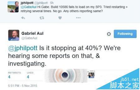 有一位surface Pro 3用户称下载Windows 10 build 10586更新失败,重启和重试好几次了,都没有用。Gabriel Aul回复称,“是不是卡在40%,我们收到了一些相关报告,目前正在调查。”有的用户明明已经100%了,更新还是失败。另外有一位Surface 3 LTE用户称同样卡在40%。Gabe问他是不是有microSD卡,把卡移除再试试。此外还有多位用户表示更新失败。