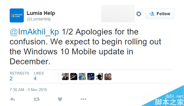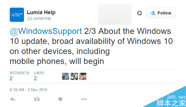 另外微软Lumia支持还表示,Win10更新将覆盖更多其他设备,包括Win10 Mobile手机等。