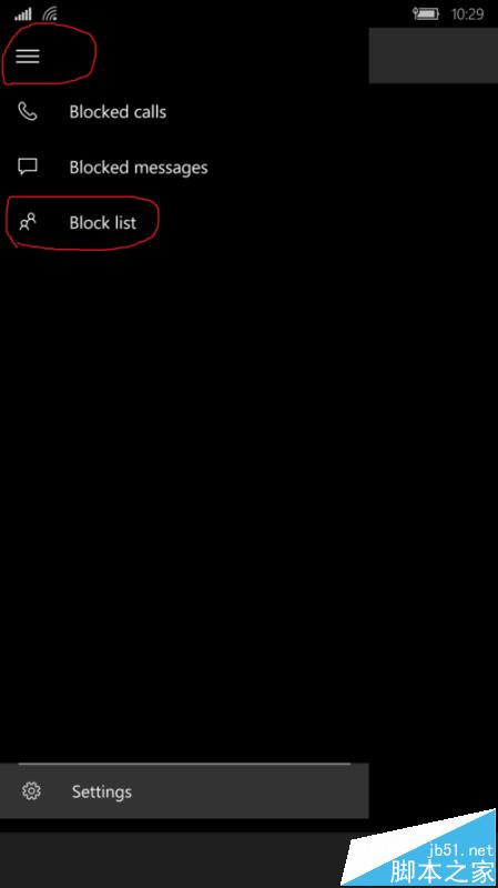 1、点击阻止和过滤界面左上角的"三"按钮呼出菜单,然后就能在菜单中进入阻止的号码列表(Block list)。
