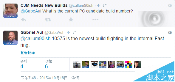 我们这位老朋友告诉他,目前微软正在内部快速通道测试Win10预览版10575。按照以往的惯例,版本推送的事如果没戏,Gabriel Aul是不会说出详细版本号的。因此,这一版本还是有望在今后的一段时间内推送的。