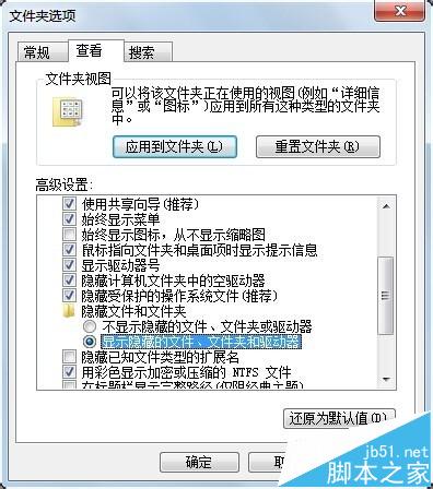 4、打开【工具】-【文件夹选项】-【查看】-点选【显示隐藏文件 、文件夹和驱动器】;若是文件夹上找不到【工具】菜单可在【组织】-【布局】-勾选【菜单】;