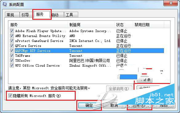 3、然后切换到“服务”选项卡,并勾选“隐藏所有Microsoft 服务”,然后选择“全部禁用”按钮;