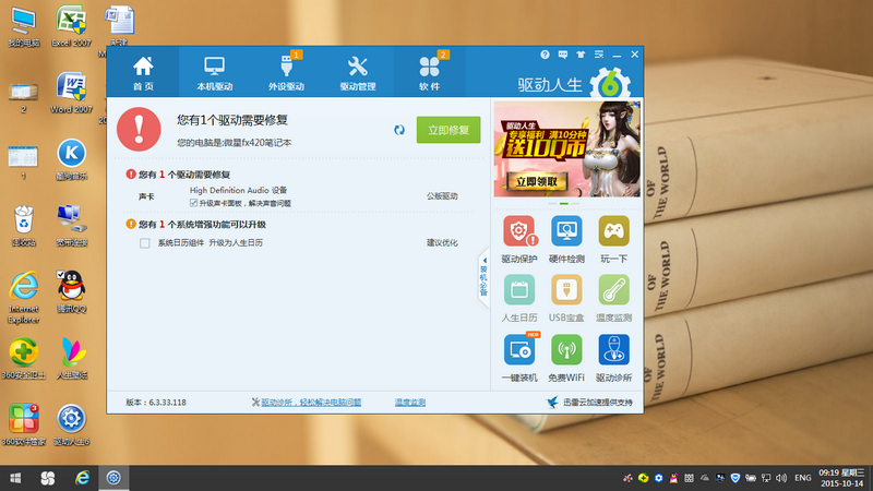 其升级Windows 10后声音忽大忽小,是因为Windows 10系统自带的声卡驱动覆盖了电脑本来的声卡驱动,表现在驱动人生上,则是声卡驱动需要修复。