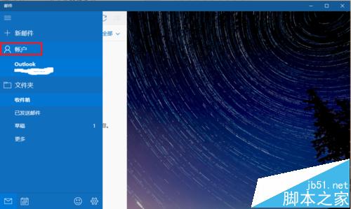 1、启动WINDOWS10邮件应用,点击邮件应用窗口的左上角“展开”图标,再点击“帐号”