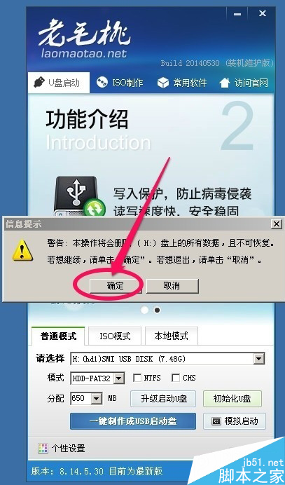 5.在出现的提示信息中我们点击确定!当然还是提醒您,如果U盘上有重要数据一定要做好备份!