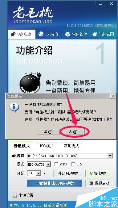 6.制作完成后,我们点击否,这样我们的U盘启动盘已经制作完成了!当然你也可以模拟启动一下看看有没有问题!