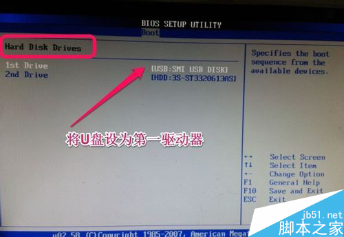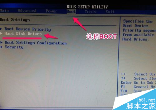 12.进入BIOS后我们选择boot项目,然后选择hard disk drives.也就是选择硬盘驱动器。然后将U盘设为第一驱动器。