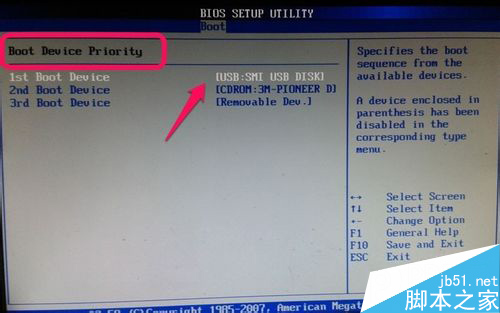 13.然后我们选择boot device priority【驱动引导顺序】,将U盘设为第一引导顺序!然后我们按键盘的F10保存我们的设置,我们已经将U盘设为了第一引导!