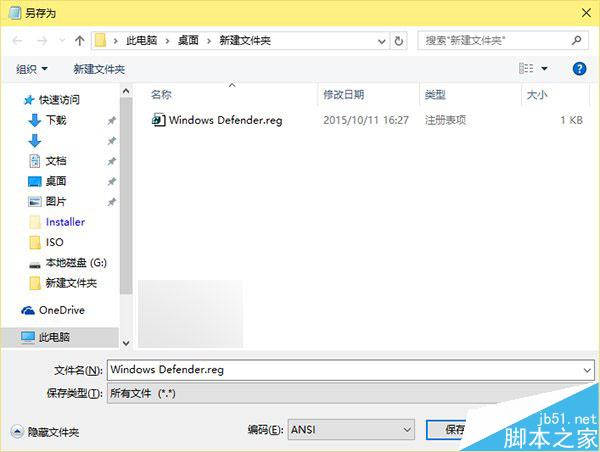 2、将代码另存为“所有文件”(保存类型),名称自拟,但后缀名一定要为“.reg”,路径随意,如下图——