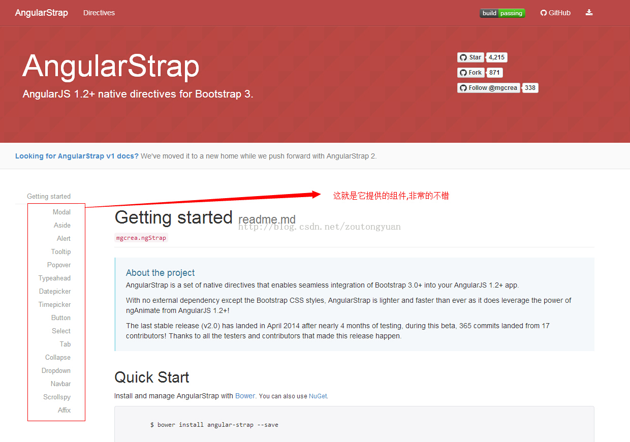 AngularStrap 是一个 在AngularJs 中 使用的 Bootstrap 组件库,比较友好。