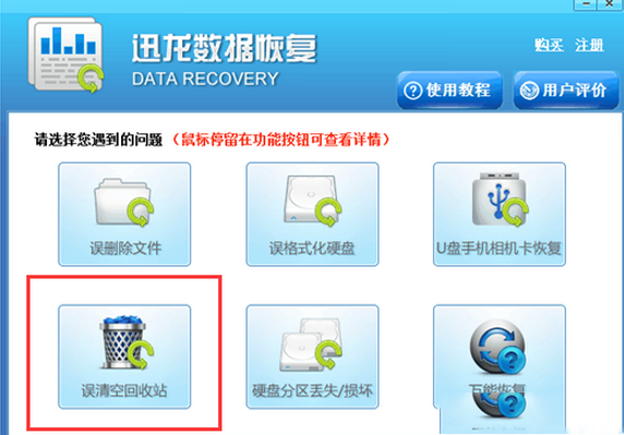 步骤1:首先用户需要下载安装迅龙数据恢复软件,打开运行进行软件的界面菜单后,请点击“误清空回收站”功能选项。