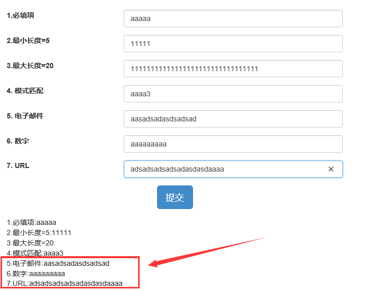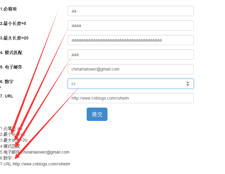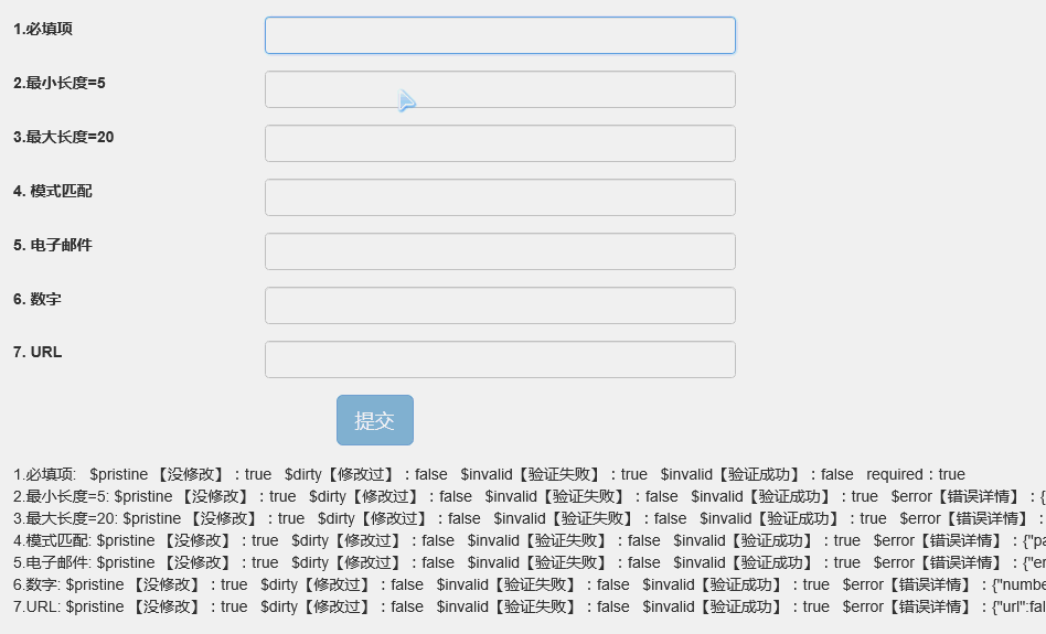 <div class="col-md-6"><form role="form" class="form-horizontal"><div class="form-group"><div class="col-md-4"><label for="name">1.必填项</label></div><div class="col-md-8"><input class="form-control" id="name" type="text" required ng-model="user.name" /></div></div><div class="form-group"><div class="col-md-4"><label for="minlength">2.最小长度=5</label></div><div class="col-md-8"><input type="text" id="minlength" ng-minlength="5" ng-model="user.minlength" class="form-control" /></div></div><div class="form-group"><div class="col-md-4"><label for="minlength">3.最大长度=20</label> </div><div class="col-md-8"><input type="text" ng-model="user.maxlength" ng-maxlength="20" class="form-control" /></div></div><div class="form-group"><div class="col-md-4"><label for="minlength">4. 模式匹配</label></div><div class="col-md-8"> <input type="text" id="minlength" ng-model="user.pattern" ng-pattern="/^[a-zA-Z]*d$/" class="form-control" /></div></div><div class="form-group"><div class="col-md-4"><label for="email">5. 电子邮件</label> </div><div class="col-md-8"><input type="email" id="email" name="email" ng-model="user.email" class="form-control" /></div></div><div class="form-group"><div class="col-md-4"><label for="age">6. 数字</label> </div><div class="col-md-8"><input type="number" id="age" name="age" ng-model="user.age" class="form-control" /></div></div><div class="form-group"><div class="col-md-4"><label for="url"> 7. URL</label> </div><div class="col-md-8"><input type="url" id="url" name="homepage" ng-model="user.url" class="form-control" /></div></div><div class="form-group text-center"><input class="btn btn-primary btn-lg" type="submit" value="提交" /></div></form></div><div class="col-md-12">1.必填项:{{user.name}}<br>2.最小长度=5:{{user.minlength}}<br>3.最大长度=20:{{user.maxlength}}<br>4.模式匹配:{{user.pattern}}<br>5.电子邮件:{{user.email}}<br>6.数字:{{user.age}}<br>7.URL:{{user.url}}<br></div>在测试中我们发现,只有当表达式满足验证,才会实时进行双向绑定。同时我们也发现,效果图如下: