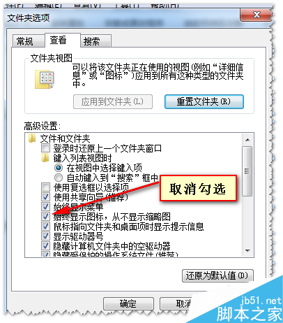 第二步:在弹出的页面中,点击”查看“,去掉”始终显示图标,从不显示缩略图“前面的勾,如图。
