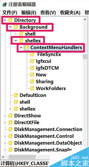 我们在HKEY_CLASSES_ROOT展开项中找到:Directory,再依次展开: