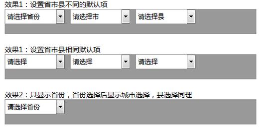 <html><head><meta http-equiv="Content-Type" content="text/html; charset=utf-8" /><title>城市三级联动</title><style type="text/css">*{ padding:0; margin:0}html,body{ height: 100%; width: 100%; position: relative; font-size:14px;}.city{ margin:20px 200px; }.selectbox{ height:50px; width:500px;background:#999;}.selectbox select{ height:30px; width:120px; margin-right:10px; border:1px solid #999; line-height:30px;}</style></head><body> <div class="city"> <p>效果1:设置省市县不同的默认项</p> <div id="selectbox1" class="selectbox"></div></div><div class="city"> <p>效果1:设置省市县相同默认项</p> <div id="selectbox2" class="selectbox"></div></div><div class="city"> <p>效果2:只显示省份,省份选择后显示城市选择,县选择同理</p> <div id="selectbox3" class="selectbox"></div></div></body><script type="text/javascript">window.onload=function(){ //效果1 三级联动 new TbdCityChoice({id:"selectbox1",type:1,province:"请选择省份",city:"请选择市",town:"请选择县",names:["name1","name2","name3"], changeend:function(p,c,t){}}).init(); //效果1 三级联动 new TbdCityChoice({id:"selectbox2",type:1,province:"请选择",city:"请选择",town:"请选择",names:["name4","name5","name6"], changeend:function(p,c,t){ alert(" 省:"+p+" 市:"+c+" 县:"+t); //根据返回做其他处理 }}).init(); //效果2 三级联动 new TbdCityChoice({id:"selectbox3",type:2,province:"请选择省份",city:"请选择市",town:"请选择县",names:["name7","name8","name9"], changeend:function(p,c,t){}}).init();};</script><script type="text/javascript">/*args.id根idargs.type 类型1 是全部显示args.province 省份默认内容args.city 市默认内容args.town 县默认内容args.names name设置args.changeend(p,c,t) 变化后的回调函数,返回对应 省份 城市 县*/function TbdCityChoice(args){ this.rootele=document.getElementById(args.id); this.type=args.type; this.province=args.province; this.city=args.city; this.town=args.town; this.nameprovince=args.names[0]; this.namecity=args.names[1]; this.nametown=args.names[2]; this.changeend=args.changeend; this.aid=null; this.bid=null; this.cid=null;this.aele=null; this.bele=null; this.cele=null; var that=this; this.onelen=mapCityChoice.length; this.init=function(){ this.appe(); this.appendone(); this.appendtwo(this.aid); this.appendthree(this.bid); this.addevent(); }; this.appe=function(){ this.aele=document.createElement("select"); this.aele.name=this.nameprovince; this.rootele.appendChild(this.aele); var tso=document.createElement("option");tso.innerHTML=this.province; tso.value=this.province; tso.checked=true; this.aele.appendChild(tso);this.bele=document.createElement("select"); this.bele.name=this.namecity; this.rootele.appendChild(this.bele);this.cele=document.createElement("select"); this.cele.name=this.nametown; this.rootele.appendChild(this.cele); if(this.type==2){this.bele.style.visibility="hidden";this.cele.style.visibility="hidden"; }; }; this.appendone=function(){for(var i=0;i<this.onelen;i++){var opo=document.createElement("option");opo.innerHTML=mapCityChoice[i].name;opo.value=mapCityChoice[i].name;this.aele.appendChild(opo); };}; this.appendtwo=function(){var tso=document.createElement("option");tso.innerHTML=this.city; tso.value=this.city; tso.checked=true; this.bele.appendChild(tso);if(this.aid==null){ }else{var arr=mapCityChoice[this.aid].city;for(var j=0;j<arr.length;j++){var opo=document.createElement("option");opo.innerHTML=arr[j].name;opo.value=arr[j].name;this.bele.appendChild(opo);}; }; }; this.appendthree=function(){ var tso=document.createElement("option");tso.innerHTML=this.town; tso.value=this.town; tso.checked=true; this.cele.appendChild(tso);if(this.bid==null){ }else{var arr=mapCityChoice[that.aid].city[this.bid].area;for(var j=0;j<arr.length;j++){var opo=document.createElement("option");opo.innerHTML=arr[j];opo.value=arr[j];this.cele.appendChild(opo);}; }; }; this.addevent=function(){ this.aele.onchange=function(){if(this.value!=that.province){that.aid=that.searchcity(this.value); if(that.type==2){ that.bele.style.visibility="visible"; that.cele.style.visibility="hidden";};}else{that.aid=null;if(that.type==2){ that.bele.style.visibility="hidden"; that.cele.style.visibility="hidden";};};that.bele.innerHTML="";that.appendtwo();that.bid=null;that.cele.innerHTML="";that.appendthree();that.eventchange(); }; this.bele.onchange=function(){if(this.value!=that.city){that.bid=that.searcharea(this.value); if(that.type==2){ that.cele.style.visibility="visible";};}else{that.bid=null;if(that.type==2){ that.cele.style.visibility="hidden";};};that.cele.innerHTML="";that.appendthree();that.eventchange(); }; this.cele.onchange=function(){that.eventchange(); }; }; this.searchcity=function(oneval){ var s; for(var i=0;i<mapCityChoice.length;i++){if(mapCityChoice[i].name==oneval){s=i;break;}; };return s; }; this.searcharea=function(twoval){ var s; for(var i=0;i<mapCityChoice[that.aid].city.length;i++){if(mapCityChoice[that.aid].city[i].name==twoval){s=i;break;}; };return s; }; this.eventchange=function(){ var resultp=(that.aele.value==that.province)?false:that.aele.value; var resultc=(that.bele.value==that.city)?false:that.bele.value; var resultt=(that.cele.value==that.town)?false:that.cele.value; that.changeend(resultp,resultc,resultt); }};</script><script type="text/javascript">//start var mapCityChoice=[{ "name": "北京", "city":[{"name":"北京", "area":["东城区","西城区","崇文区","宣武区","朝阳区","丰台区","石景山区","海淀区","门头沟区","房山区","通州区","顺义区","昌平区","大兴区","平谷区","怀柔区","密云县","延庆县"]}]},{ "name": "天津", "city":[{"name":"天津", "area":["和平区","河东区","河西区","南开区","河北区","红桥区","塘沽区","汉沽区","大港区","东丽区","西青区","津南区","北辰区","武清区","宝坻区","宁河县","静海县","蓟 县"]}]},{ "name": "河北", "city":[ {"name":"石家庄", "are