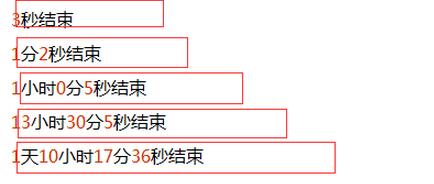 <!DOCTYPE html><html> <head><meta charset="utf-8"/><title>倒计时</title><link rel="stylesheet" href="css/common.css" type="text/css" charset="utf-8"/><style type="text/css">*{ margin:0; padding:0;}.dtime{ margin:10px;}.dtime span{ color:#C30;}</style></head> <body> <div class="dtime" id="a1"></div><div class="dtime" id="a2"></div><div class="dtime" id="a3"></div><div class="dtime" id="a4"></div><div class="dtime" id="a5"></div> </body><script> function tbdTimeCountdown(args){//倒计时函数var ele=document.getElementById(args.id);var alltime=args.alltime;var arr=[]; var t=Math.floor(alltime/(24*60*60));var yt=alltime%(24*60*60); var s=Math.floor(yt/(60*60));var ys=yt%(60*60); var f=Math.floor(ys/(60));var yf=ys%(60); var m=yf; arr[0]=[t,"天"];arr[1]=[s,"小时"];arr[2]=[f,"分"];arr[3]=[m,"秒结束"]; var s=ce(arr,0); ele.innerHTML=s; var dong; dong=setInterval(function(){ alltime-=1; if(alltime<=0){clearInterval(dong);ele.innerHTML="<span>0</span>秒";args.end(); }else{t=Math.floor(alltime/(24*60*60));yt=alltime%(24*60*60); s=Math.floor(yt/(60*60));ys=yt%(60*60); f=Math.floor(ys/(60));yf=ys%(60); m=yf; arr[0]=[t,"天"];arr[1]=[s,"小时"];arr[2]=[f,"分"];arr[3]=[m,"秒结束"]; var s=ce(arr,0); ele.innerHTML=s; };},1000); function ce(arr,sta){ var i=sta; if(i<arr.length){if(arr[i][0]!=0){ var s=""; for(var j=i;j<arr.length;j++){s+="<span>"+arr[j][0]+"</span>"+arr[j][1]; }; return s;}else{ return ce(arr,i+1);}; };}; };//倒计时end //效果1 //86402 3602 62 tbdTimeCountdown({id:"a1",//含有倒计时容器alltime:3,//倒计时总秒数end:function(){//倒计时结束,时间为0是调用的函数 //alert("倒计时结束才会执行!");},}); //效果2 tbdTimeCountdown({id:"a2",//含有倒计时容器alltime:62,//倒计时总秒数end:function(){//倒计时结束,时间为0是调用的函数},}); //效果3 tbdTimeCountdown({id:"a3",//含有倒计时容器alltime:3602,//倒计时总秒数end:function(){//倒计时结束,时间为0是调用的函数},}); //效果4 tbdTimeCountdown({id:"a4",//含有倒计时容器alltime:86402,//倒计时总秒数end:function(){//倒计时结束,时间为0是调用的函数},}); //效果4 tbdTimeCountdown({id:"a5",//含有倒计时容器alltime:154789,//倒计时总秒数end:function(){//倒计时结束,时间为0是调用的函数},}); </script></html><!DOCTYPE html><html> <head><meta charset="utf-8"/><title>倒计时</title><link rel="stylesheet" href="css/common.css" type="text/css" charset="utf-8"/><style type="text/css">*{ margin:0; padding:0;}.dtime{ margin:10px;}.dtime span{ color:#C30;}</style></head> <body><div class="dtime" id="a1" alltime="3"></div><div class="dtime" id="a2" alltime="62"></div><div class="dtime" id="a3" alltime="3605"></div><div class="dtime" id="a4" alltime="48605"></div><div class="dtime" id="a5" alltime="123456"></div> </body><script> function tbdTimeCountdown(args){//倒计时函数var ele=document.getElementById(args.id);var alltime=Number(ele.getAttribute(args.alltime));var arr=[]; var t=Math.floor(alltime/(24*60*60));var yt=alltime%(24*60*60); var s=Math.floor(yt/(60*60));var ys=yt%(60*60); var f=Math.floor(ys/(60));var yf=ys%(60); var m=yf; arr[0]=[t,"天"];arr[1]=[s,"小时"];arr[2]=[f,"分"];arr[3]=[m,"秒结束"]; var s=ce(arr,0); ele.innerHTML=s; var dong; dong=setInterval(function(){ alltime-=1; ele.setAttribute(args.alltime,alltime); if(alltime<=0){clearInterval(dong);ele.innerHTML="<span>0</span>秒";args.end(); }else{t=Math.floor(alltime/(24*60*60));yt=alltime%(24*60*60); s=Math.floor(yt/(60*60));ys=yt%(60*60); f=Math.floor(ys/(60));yf=ys%(60); m=yf; arr[0]=[t,"天"];arr[1]=[s,"小时"];arr[2]=[f,"分"];arr[3]=[m,"秒结束"]; var s=ce(arr,0); ele.innerHTML=s; };},1000); function ce(arr,sta){ var i=sta; if(i<arr.length){if(arr[i][0]!=0){ var s=""; for(var j=i;j<arr.length;j++){s+="<span>"+arr[j][0]+"</span>"+arr[j][1]; }; return s;}else{ return ce(arr,i+1);}; };}; };//倒计时end //效果1 //86402 3602 62 tbdTimeCountdown({id:"a1",//含有倒计时容器alltime:"alltime",//倒计时总秒数end:function(){//倒计时结束,时间为0是调用的函数 alert("倒计时结束才会执行!");},}); //效果2 tbdTimeCountdown({id:"a2",//含有倒计时容器alltime:"alltime",//倒计时总秒数end:function(){//倒计时结束,时间为0是调用的函数},}); //效果3 tbdTimeCountdown({id:"a3",//含有倒计时容器alltime:"alltime",//倒计时总秒数end:function(){//倒计时结束,时间为0是调用的函数},}); //效果4 tbdTimeCountdown({id:"a4",//含有倒计时容器alltime:"alltime",//倒计时总秒数end:function(){//倒计时结束,时间为0是调用的函数},}); //效果4 tbdTimeCountdown({id:"a5",//含有倒计时容器alltime:"alltime",//倒计时总秒数end:function(){//倒计时结束,时间为0是调用的函数},}); </script></html>大家可以参考专题 《js倒计时功能汇总》 进行深入学习。