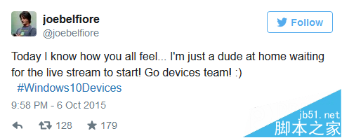 有趣的是今天Joe Belfiore乔北峰似乎并没有来到现场,他在Twitter上喊话称和大家一样在等待直播信号的到来。