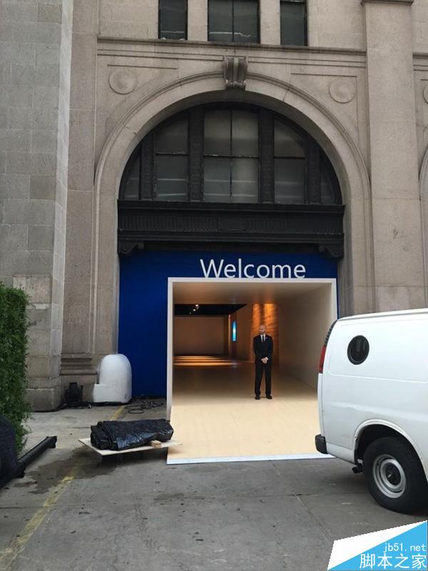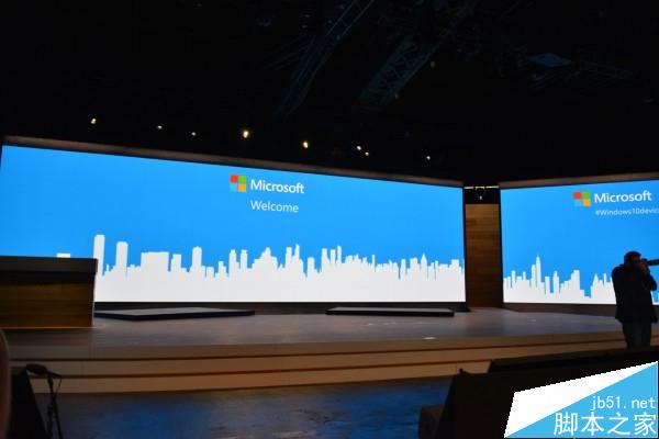 本次微软选择的Skylight会场位于纽约曼哈顿西33街,前身是历史悠久的James A. Farley邮局,共有41000平方英尺前邮件分拣室和33000平方英尺的Postal Dock,是纽约充满历史气息的地标性建筑,舞台上有两个大型屏幕和一张长窄型桌子,屏幕上投影着蓝色背景的欢迎图案。