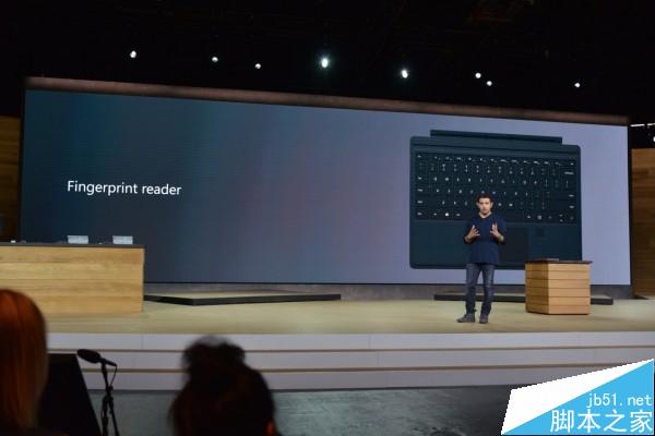 现场正在播放产品介绍视频,我们可以明确看到指纹识别装置的存在。12.3英寸的屏幕,1024级别压感手写笔,更薄的Type Cover,混合式散热系统。