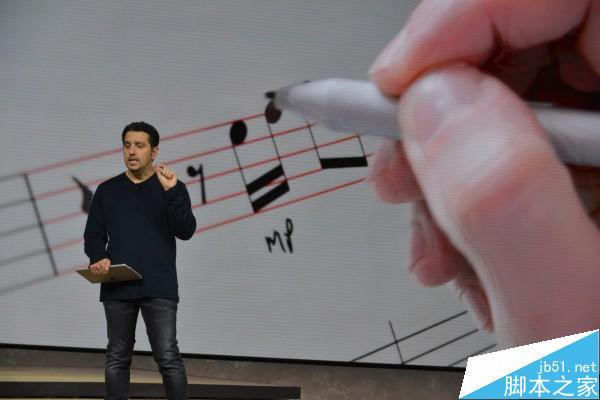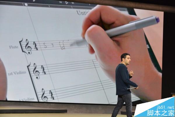 大屏幕视频演示如何用Surface Pro 4的手写笔描绘曲谱。