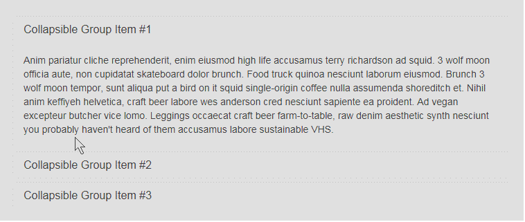 <div class="container" style="margin-top:140px;"><div class="panel-group" id="accordion"><div class="panel panel-default"><div class="panel-heading"><h4 class="panel-title"><a data-toggle="collapse" data-toggle="collapse" data-parent="#accordion" href="#collapseOne"> Collapsible Group Item </a></h4></div><div id="collapseOne" class="panel-collapse collapse in"><div class="panel-body"> Anim pariatur cliche reprehenderit, enim eiusmod high life accusamus terry richardson ad squid. 3 wolf moon officia aute, non cupidatat skateboard dolor brunch. Food truck quinoa nesciunt laborum eiusmod. Brunch 3 wolf moon tempor, sunt aliqua put a bird on it squid single-origin coffee nulla assumenda shoreditch et. Nihil anim keffiyeh helvetica, craft beer labore wes anderson cred nesciunt sapiente ea proident. Ad vegan excepteur butcher vice lomo. Leggings occaecat craft beer farm-to-table, raw denim aesthetic synth nesciunt you probably haven"t heard of them accusamus labore sustainable VHS.</div></div></div><div class="panel panel-default"><div class="panel-heading"><h4 class="panel-title"><a data-toggle="collapse" data-toggle="collapse" data-parent="#accordion" href="#collapseTwo"> Collapsible Group Item #2 </a></h4></div><div id="collapseTwo" class="panel-collapse collapse"><div class="panel-body"> Anim pariatur cliche reprehenderit, enim eiusmod high life accusamus terry richardson ad squid. 3 wolf moon officia aute, non cupidatat skateboard dolor brunch. Food truck quinoa nesciunt laborum eiusmod. Brunch 3 wolf moon tempor, sunt aliqua put a bird on it squid single-origin coffee nulla assumenda shoreditch et. Nihil anim keffiyeh helvetica, craft beer labore wes anderson cred nesciunt sapiente ea proident. Ad vegan excepteur butcher vice lomo. Leggings occaecat craft beer farm-to-table, raw denim aesthetic synth nesciunt you probably haven"t heard of them accusamus labore sustainable VHS. </div></div></div><div class="panel panel-default"><div class="panel-heading"><h4 class="panel-title"><a data-toggle="collapse" data-toggle="collapse" data-parent="#accordion" href="#collapseThree"> Collapsible Group Item #3 </a></h4></div><div id="collapseThree" class="panel-collapse collapse"><div class="panel-body"> Anim pariatur cliche reprehenderit, enim eiusmod high life accusamus terry richardson ad squid. 3 wolf moon officia aute, non cupidatat skateboard dolor brunch. Food truck quinoa nesciunt laborum eiusmod. Brunch 3 wolf moon tempor, sunt aliqua put a bird on it squid single-origin coffee nulla assumenda shoreditch et. Nihil anim keffiyeh helvetica, craft beer labore wes anderson cred nesciunt sapiente ea proident. Ad vegan excepteur butcher vice lomo. Leggings occaecat craft beer farm-to-table, raw denim aesthetic synth nesciunt you probably haven"t heard of them accusamus labore sustainable VHS. </div></div></div></div></div>第一步:首先最外面那层panel-group这层下面包括几个小组。