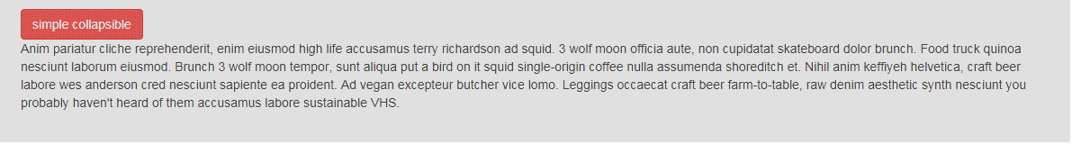 <div class="container" style="margin-top:140px;"><button type="button" class="btn btn-danger" data-toggle="collapse" data-target="#demo"> simple collapsible </button><div id="demo" class="collapse in">Anim pariatur cliche reprehenderit, enim eiusmod high life accusamus terry richardson ad squid. 3 wolf moon officia aute, non cupidatat skateboard dolor brunch. Food truck quinoa nesciunt laborum eiusmod. Brunch 3 wolf moon tempor, sunt aliqua put a bird on it squid single-origin coffee nulla assumenda shoreditch et. Nihil anim keffiyeh helvetica, craft beer labore wes anderson cred nesciunt sapiente ea proident. Ad vegan excepteur butcher vice lomo. Leggings occaecat craft beer farm-to-table, raw denim aesthetic synth nesciunt you probably haven"t heard of them accusamus labore sustainable VHS.</div>
