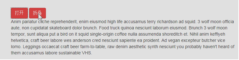<button type="button" class="btn btn-danger" onClick="Open()">打开</button><button type="button" class="btn btn-danger" onClick="Hide()">折叠</button><div id="demo" class="collapse in">Anim pariatur cliche reprehenderit, enim eiusmod high life accusamus terry richardson ad squid. 3 wolf moon officia aute, non cupidatat skateboard dolor brunch. Food truck quinoa nesciunt laborum eiusmod. Brunch 3 wolf moon tempor, sunt aliqua put a bird on it squid single-origin coffee nulla assumenda shoreditch et. Nihil anim keffiyeh helvetica, craft beer labore wes anderson cred nesciunt sapiente ea proident. Ad vegan excepteur butcher vice lomo. Leggings occaecat craft beer farm-to-table, raw denim aesthetic synth nesciunt you probably haven"t heard of them accusamus labore sustainable VHS.</div><div class="panel-group" id="accordion" style="margin-top:240px;"><script type="text/javascript">$(function(){$("#demo").collapse({ toggle: false })})function Open(){$("#demo").collapse("show");}function Hide(){$("#demo").collapse("hide");}</script>来看一下上面的效果