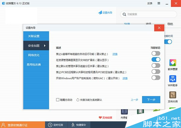 在魔方主窗口中点击“设置向导”,然后在“安全加固”中将UAC关闭即可