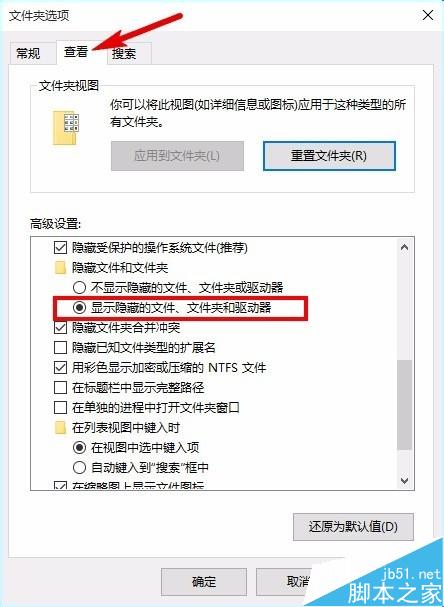 2、在“文件夹选项”窗口中,点击“查看”标签,选择“显示隐藏的文件、文件夹和驱动器”。然后点确定。