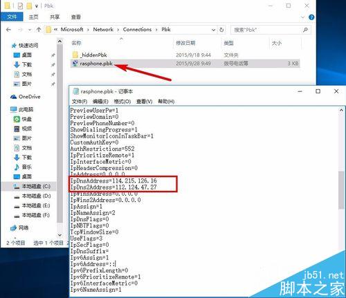 4、右键选择rasphone.pbk,打开方式选择记事本。然后查找IpDnsAddress和IpDns2Address(这两处分别对应首选DNS地址和备用DNS地址),输入oneDNS的两个ip,