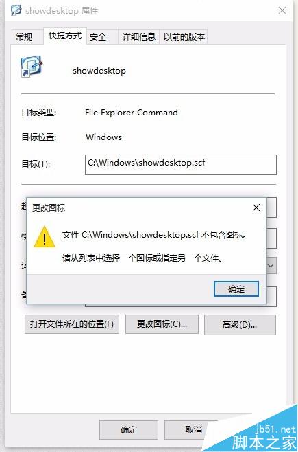 6、右键点击showdesktop.exe这个文件,选择属性。将exe的后缀改成scf。然后确定。win10会显示提示,选择是或继续就行。如图所示