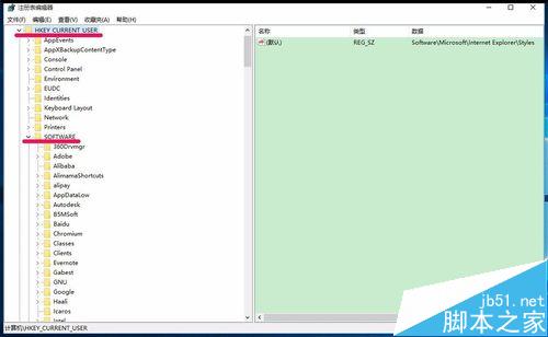 2、在打开的注册表编辑器窗口。依次展开:HKEY_CURRENT_USERSoftware;