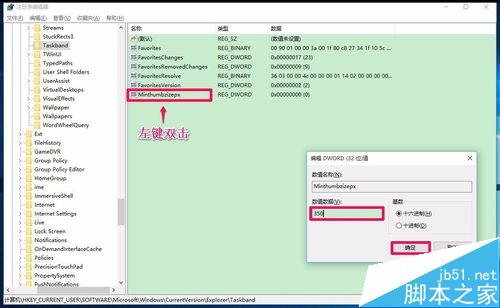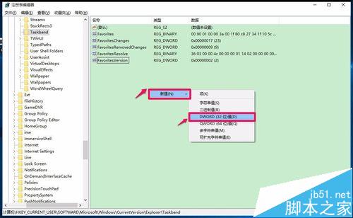 5、我们在Explorer展开项中找到Taskband,并左键单击:Taskband,查看Taskband对应的右侧窗口有没有Minthumbzizepx项,如果没有,右键点击空白处 - 新建 - WORD(32位)值,命名为:Minthumbzizepx;