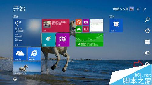 2、‘如果在开始界面,也可以使用Windows+C组合键,或者将鼠标停靠在屏幕左边弹出超级菜单→设置。