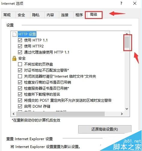 2、在“internet选项”选项卡中选择“高级”,然后把设置下方的框框中的下拉条往下拉。