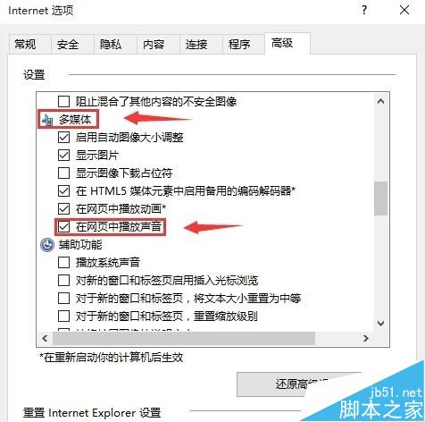 3、往下拉后面看到”多媒体”,然后把”在网页中播放声音”前面的勾去掉,然后点击” 确定”即可。