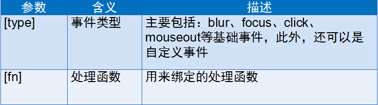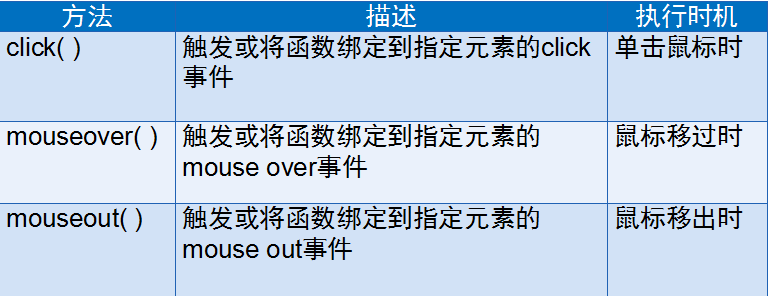 // 查询输入框$("input[name="search"]").focus(function(){ $(this).val(""); });$("input[name="search"]").blur(function(){ $(this).val("请输入要查询的问题"); });4.绑定事件与移除事件 bind():绑定事件01.绑定一个$("input[name=event_1]").bind("click",function() { $("p").css("background-color","#F30");});02.绑定多个$("input[name=event_1]").bind({mouseover: function () { $("ul").css("display", "none");},mouseout: function () { $("ul").css("display", "block");}}); unbind([type],[fn]):移除事件
