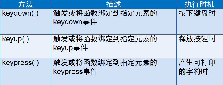 $(function () { $("li").mouseover(function () { //鼠标移过时$(this).css("background","blue"); }).mouseout(function () { //鼠标移过后$(this).css("background",""); });});2.键盘事件