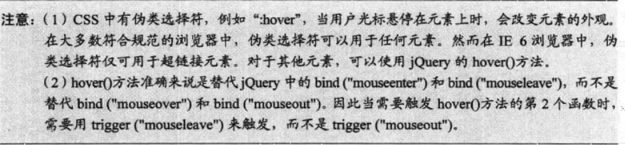 当unbind()不带参数时,表示移除所绑定的全部事件5. 复合事件 1.hover()方法 hover()方法相当于mouseover与mouseout事件的组合,用于模拟鼠标指针悬停事件