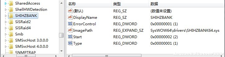 请点击开始-运行,输入regedit打开注册表后定位到HKEY_LOCAL_MACHINESYSTEMCurrentControlSetServices下,点击编辑-查找,输入shihzbank64.sys,搜索到的键中ImagePath字段就是驱动文件具体目录,如图所示