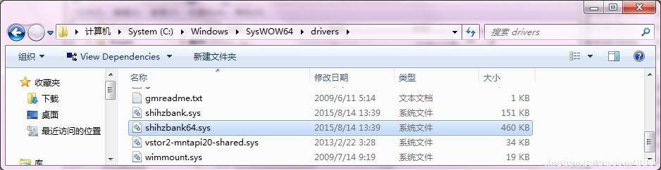 2、删除文件,通过第1步定位到驱动对应的注册表键后,ImagePath字段对应的文件目录为syswow64driversshihzbank64.sys,打开C:windowssyswow64drivers删除shihzbank64.sys即可。