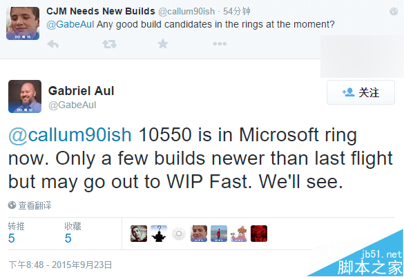 有Win10用户在这位微软副总裁的Twitter上询问,最近是否有比较好的Win10版本。Gabriel Aul回答说,目前Win10预览版10550正在微软内测。现在只有少量版本比最近的Build 10547更新颖,但(该版本)可能会向Windows Insider Program会员快速通道推送,我们拭目以待。