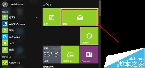 1、首先我们点击Win10的开始菜单,然后点击这里的邮件应用打开进入。